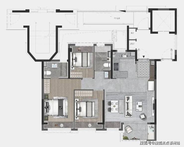 项目建面约103㎡3房同样是 三开间+大横厅 的布局,但在主卧尺度上更进一步,可以隔出一个大衣帽间和化妆间,让女主人释放买买买的天性!