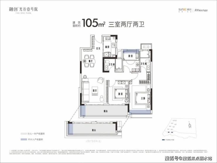 ①建面约105平,三室两厅两卫,中间户。