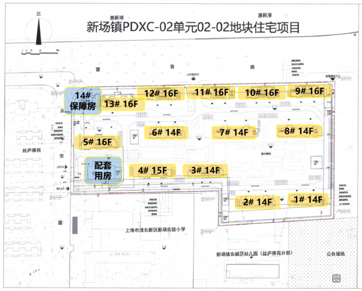 根据项目设计方案显示, 拟建6栋14F商品房、1栋15F商品房、6栋16F商品房 、1栋16F保障房、1栋2F社区配套、1个KT站、5个PT站地上建筑、1个垃圾房、1座地下车库。