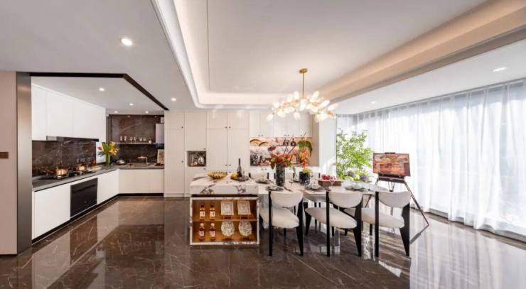 玄关层即公区层,约6.9米面宽的餐客厅+茶歇区+环U厨房,办个私家派对不在话下。往下走是卧室层,有长者套房和二孩双卧。