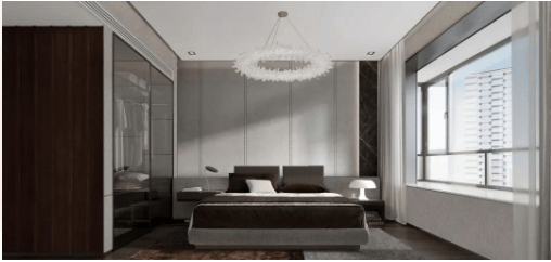 在 主卧的打造上是经典的“酒店式”套房设计,在保证私密空间不受打扰的同时,还拥有清晰流畅的动线快速抵达其他功能区。