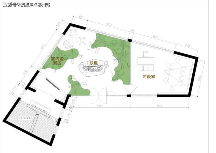 该度假酒店以热带雨林为主题,因运营所需,需要为酒店设计一个临时接待处。营造绿植环抱的氛围,以强化其热带雨林主题的体验感。经过论证,选择项目建设地边的一个已建成临时建筑,将其改造为接待处。室内空间的设计重点放在沙盘展示区,以绿植围绕沙盘。局部设置镜面,以反射植物形象,在视觉体验上增强空间感,实现“满眼绿”。