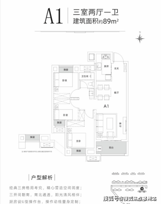 3开间朝南,主次卧均带有飘窗,可拓展一定面积。