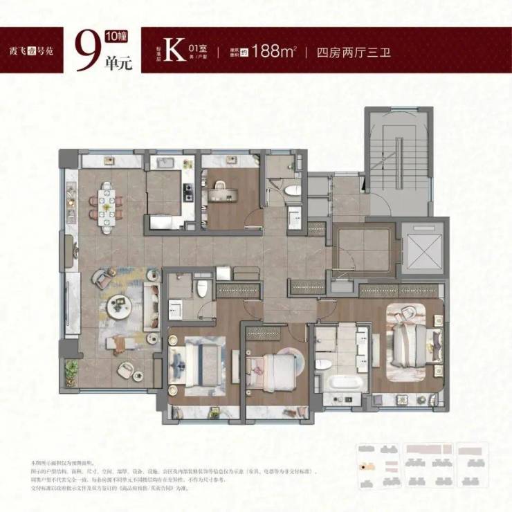 约188㎡四房:作为项目的 “旗舰户型”,188㎡四房三卫采用十字中轴动线,三卧朝南 + 双套房设计,满足多代家庭对隐私与阳光的双重需求。