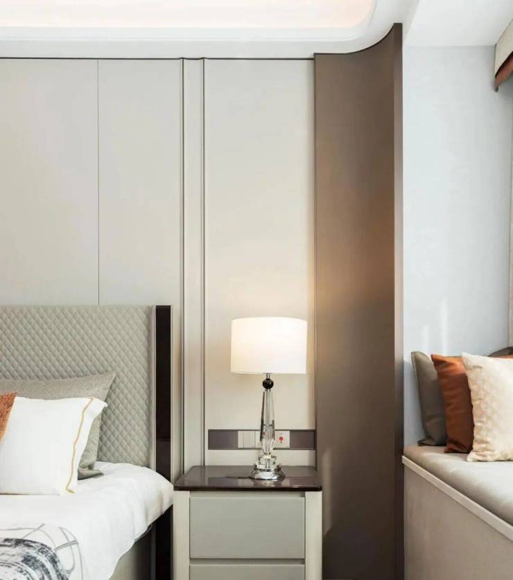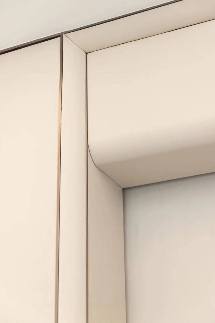 踏入样板间的第一秒,你会发现这里 几乎“看不到一个直角”:墙面转角、吊顶边缘、门套线条,甚至石材台面与柜体边缘,均以流畅圆弧替代生硬直角。