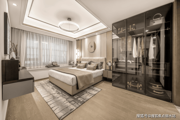 奢阔主卧套房设计, 从北到南,依次是全明主卫、L型走入式衣帽间(预留空间)、卧室和与房等宽的观景大飘窗,完全的南北通透,让穿堂风时时进来,再也不必担心湿度爆表的梅雨季和空气的异味。