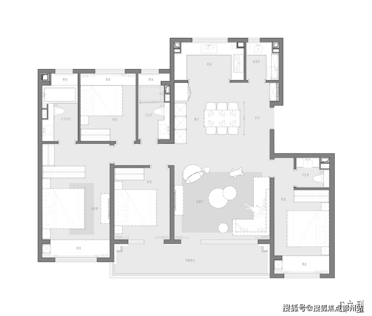 厨房、餐厅、客厅、阳台都能彻底连通,不仅南北通透,全屋空气对流,更带有开阔横厅,直通景观大阳台,堪称一绝,邀请三五好友来开派对,毫无问题。