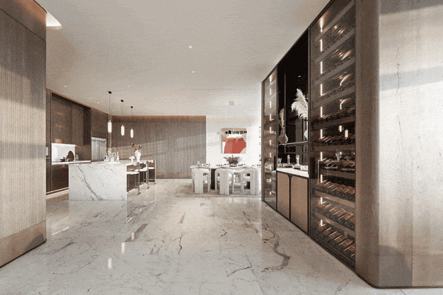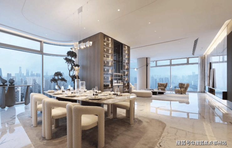 F+P的顶级豪宅设计经验与顶级酒店设计王者HBA的奢华体验,碰撞出全新灵感,尽呈登峰造极的顶豪E户型样板间。眼前尽是壮阔景象, 客、餐、厨一体设计,呈现比排球场还大的无界奢厅,大气卓越。它以 大岛台为枢纽,营造 硅谷精英式的社交生活,也尽可满足名流酒会、家族宴会,亦或是董事会议的临时场所。