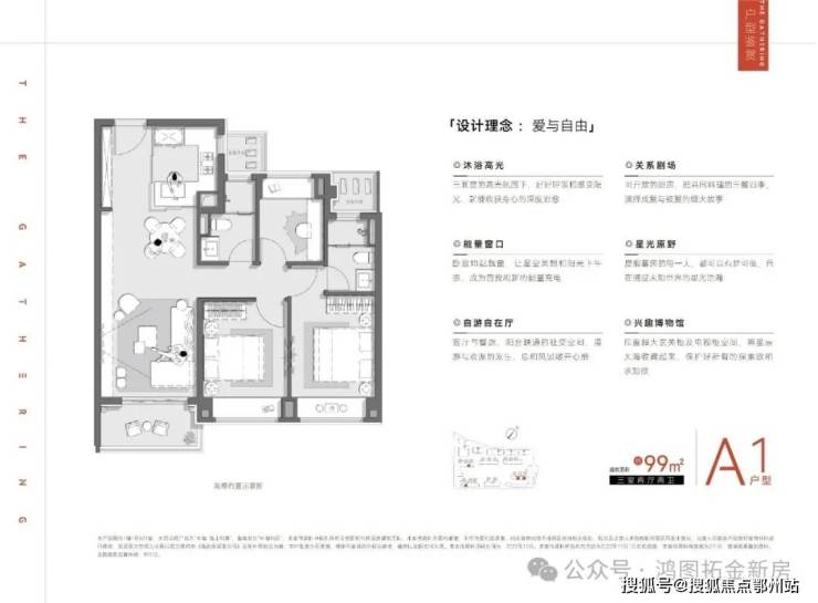 建面约 99㎡3 房,总价约 1200 - 1270 万,创新开放式厨房设计,三开间朝南,主卧套房搭配双次卧,全屋精细化收纳系统,让每一寸空间都得到充分利用。