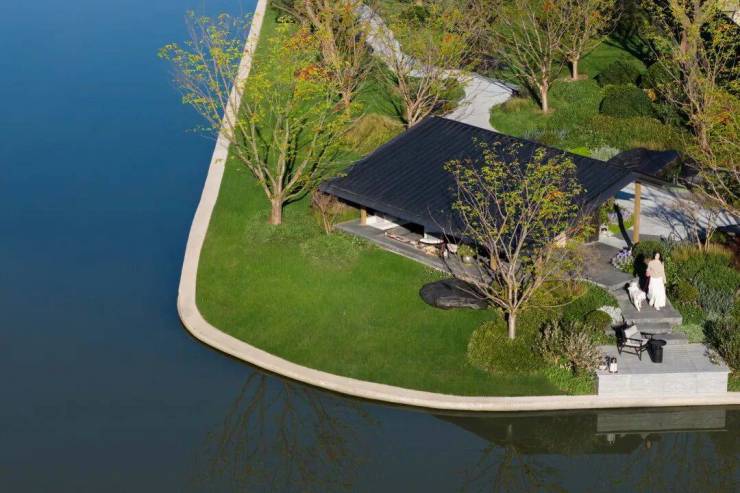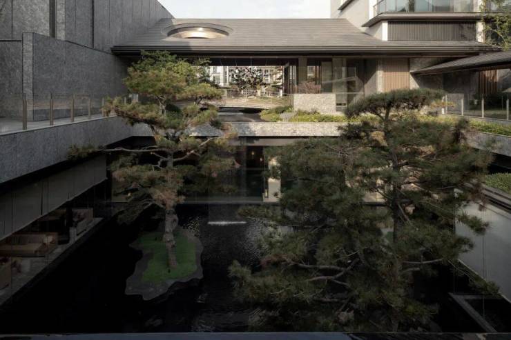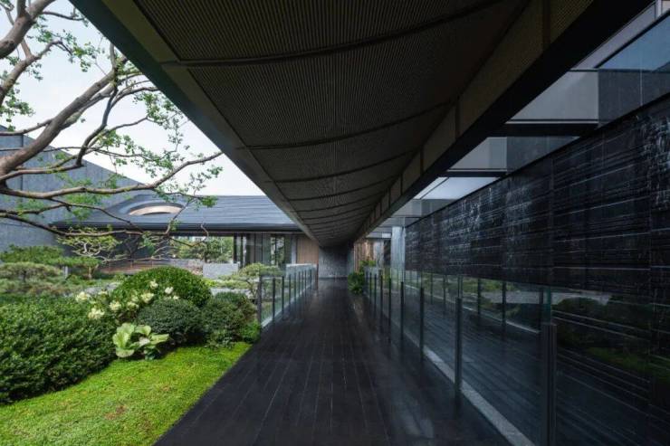 走过约40米和风游廊、黛色青瓦下,踏星而行,复现古时大宅堂前,实现四季有景、步移景异,在自然行径之中,构建「四水归堂」的风雅之景