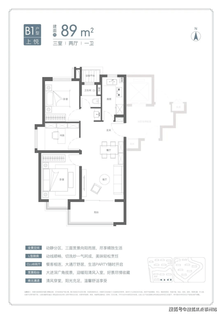 U型厨房、餐厅、客厅、阳台一线联通,南北通透。主卧套房、全卧飘窗、次卫干湿分离也都是标配。