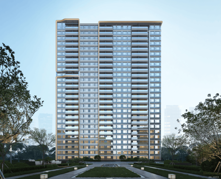 再加上香槟金型材金石嵌套设计,这一配色使建筑立面变得更加柔和,代表温和尊贵的价值取向。
