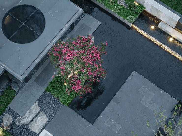 项目更让人惊喜的是: 打造了长约200米,近1000平的灵活水系覆盖整个社区, 并将静水、跌水、瀑布等不同形态水景观置入,形成五种风格的水景观。