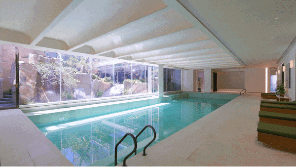 室内恒温泳池,背景运用了宝格丽绿奢石,配上艺术感的天花板。侧面是全景玻璃,正对下沉庭院的立体山水景观,阳光充沛。