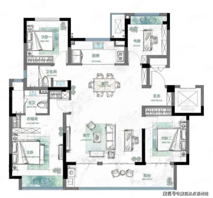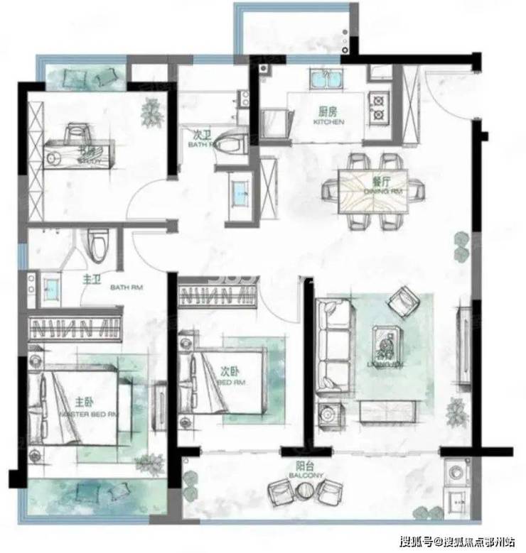 99平和117平高层的户型非常方正,都是开间朝南、双阳台的设计,空间尺度更加顺应改善群体的需求。
