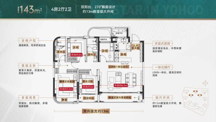 约13米南向大面宽、四开间朝南,把全天候阳光与清风引入室内,藏满惬意生活小确幸。
