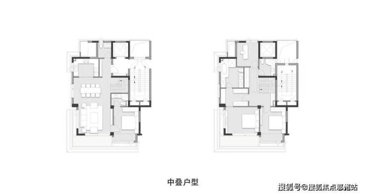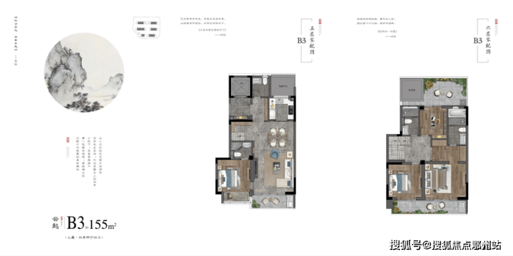 3楼到4楼为中叠,建面约为160、170㎡;5-6层加顶层露台为上叠,建面约155㎡、165㎡