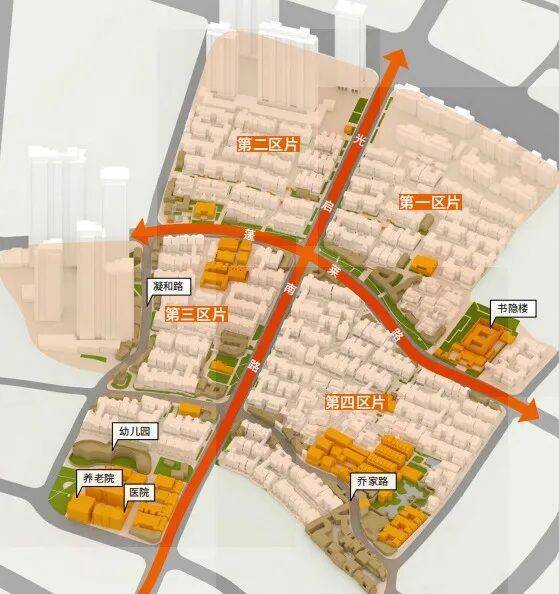 第三片区:以蓬莱路市场、凝和路商业街以及幼儿园、养老院、医院为公共服务配套的居住组团