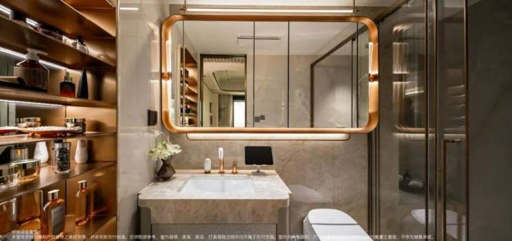 走进主卫,镜柜是高端定制款,内部带美妆冰箱,能放护肤品、化妆品。