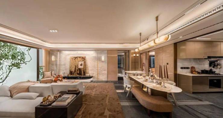 在材质与细节上,115㎡户型从入户开始就拉满顶豪质感,木饰面可随心切换高光白栓木/ 雅光球莎木双款木饰面,搭配铂金冰玉等三款岩板背景墙,让小户型也有不妥协的专属格调。