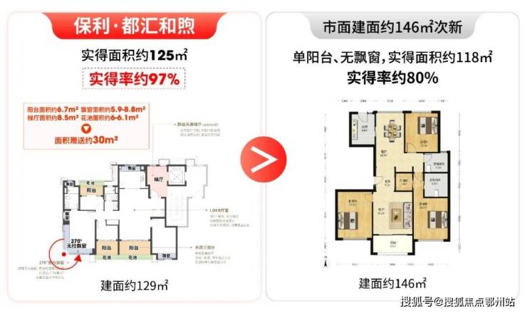 洋房标准层边套赠送面积约30㎡,实得率高达97%,相当于直接赠送约200多万价值,常规项目80%的实得率与之相比差距明显,该户型实际可享受常规155-160㎡的空间尺度。
