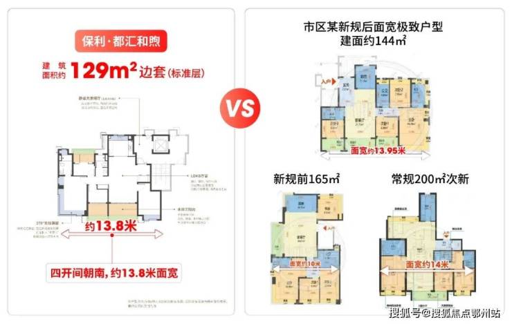 常规别墅多为两开间约6米面宽,而项目129㎡洋房全系四开间朝南,面宽近14米。