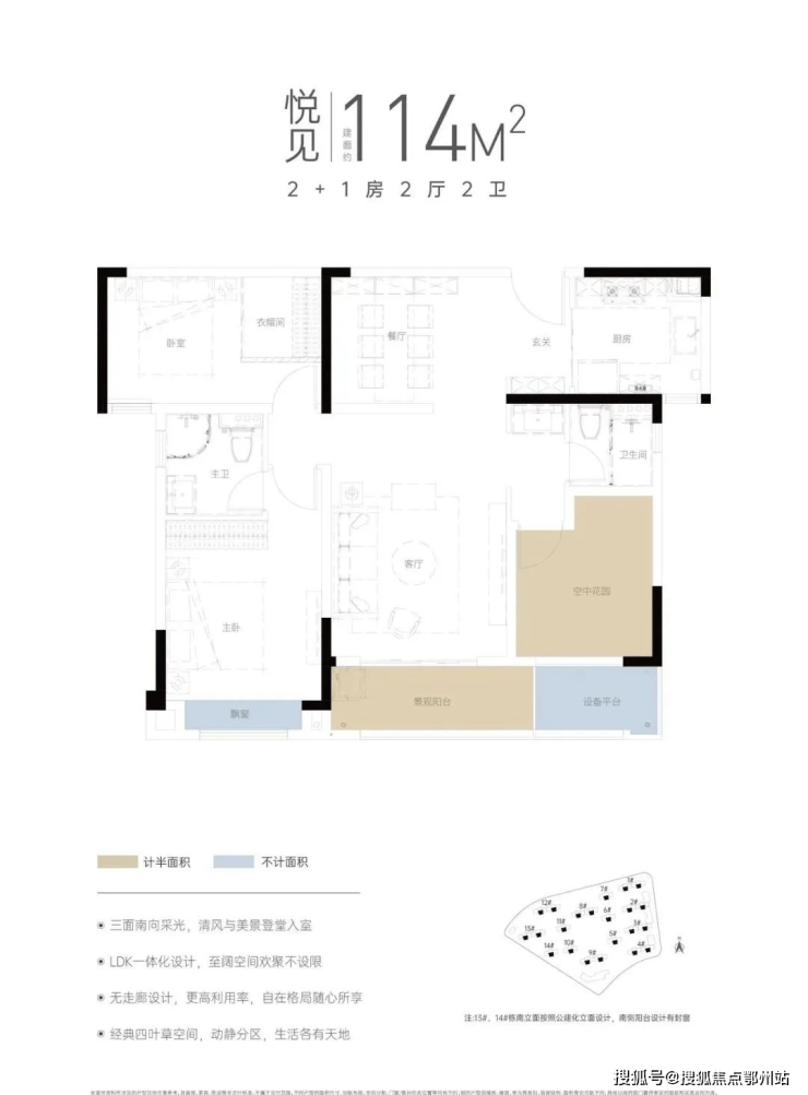 ·建面约114㎡2+1房 ,三开间朝南,充分考虑家庭成长与均好需求,主次卧开间皆超3米,客餐厅等面宽,营造约30㎡餐客一体空间,各功能区尺度均衡,南向景观阳台开间约6.8米(含设备平台),实现小户型大空间