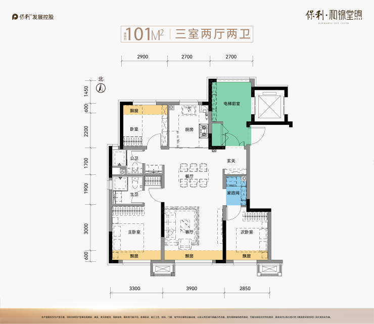 户型亮点:5大升级亮点,全系三房起步,全系酒店式套房主卧,全系送南北飘窗,全系配置家政间,全系客厅落地窗,百平以上全明电梯前室