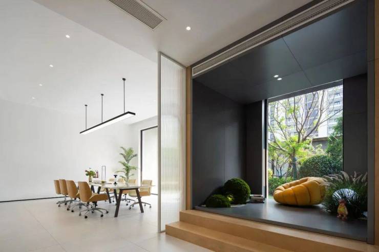 人们想要的松弛感下楼即享, 11#架空层-微work,将景观引入架空层,办公功能融入生活,推崇“ 社交型work”理念,在此聊天、冥想、娱乐,于室内风格上追求年轻活力、时尚、社交感,重塑链接业主社交的活跃空间,让空间本身成为一种容器。