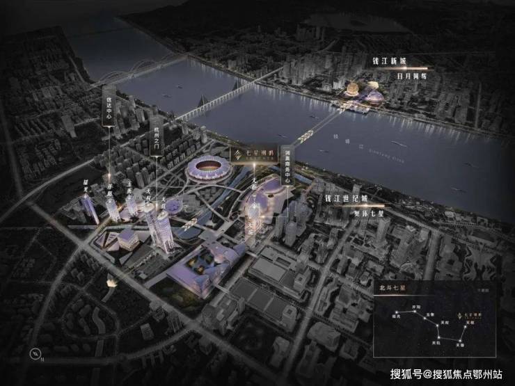 规划层面,项目所在的中轴线自武林广场延伸至钱江世纪城,贯穿杭州核心CBD集群。作为北斗七星地标体系的首位节点,天枢星位建筑不仅承载着城市门户地标功能,更与钱江新城地标建筑群形成对望格局。项目半径2公里范围内汇聚国际博览中心、城市之门双塔等战略级配套,形成集行政、会展、商务于一体的城市会客厅。