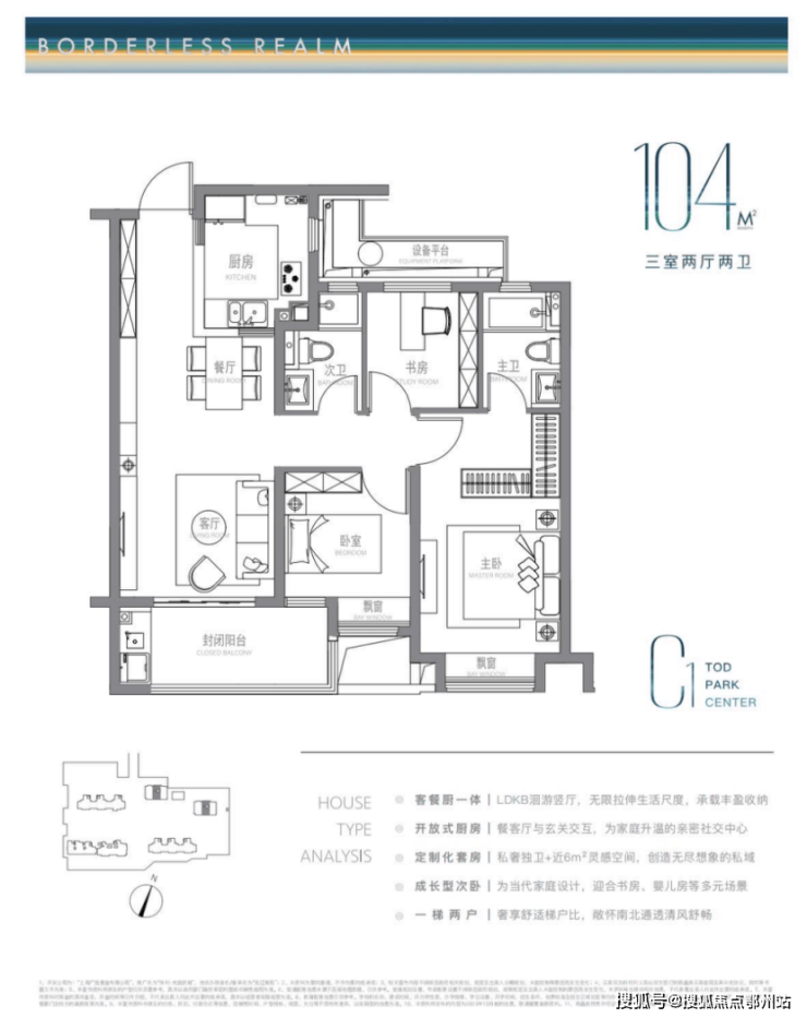 建面约104m²户型特点: LDKB洄游式竖厅+开放式厨房,生活尺度无限拉伸,主卧近6m²灵感空间,承载更多功能可能,成长型的次卧,书房儿童房随心所欲。