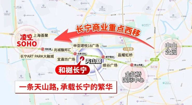 21世纪,伴随着虹桥崛起和2号线的贯通,天山路/2号线双命脉重合,东段承载中山公园CBD商务和天山商圈商业功能,中段聚焦文教居住,西段对接虹桥临空经济区,天山路成为了长宁新时代的中轴线和发展重点。