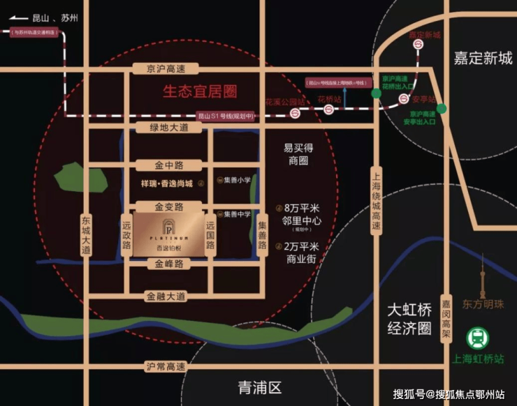 香逸铂悦位于苏州市昆山市花桥镇。项目位于大虹桥生活圈双轨交汇地,轨道交通上海11号线及苏州11号线无缝链接沪昆苏跨省交通脉络,畅享大时代下的大虹桥都市圈核心地。低密度的宜居环境,高度集合的生活配套,成功为业主营造了一个高效、高便捷、高智能的综合生活区。