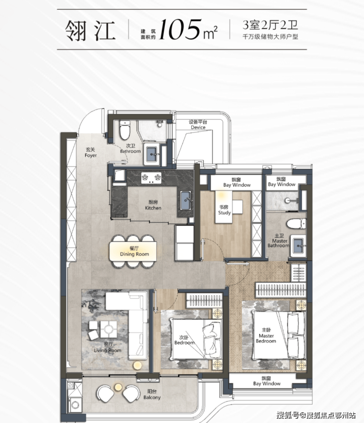 l超拓设计:三开间朝南+横厅,主卧套房配置独立衣帽间及270°转角飘窗,空间利用率大大提升。