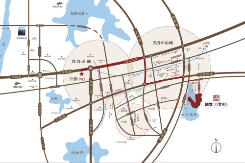 项目位于红莲湖东侧地处武汉和鄂州的交界地带,位于红莲湖国际生态旅游度假区,属于光谷中心城的后花园。从本案出发,走创业大道(未来一路,未来二路,未来三路),上高新大道可便捷到达光谷新中心光谷东。上武黄高速(高新大道,高新四路)在三环可以选择任意出口下可到达光谷鲁巷商圈。从整个武汉的范围来看,西距武汉29公里,北距葛店经济技术开发区13公里。后期不管是走武黄高速、还是高新四路、高新六路这三条路都可以通过外环或三环到达武汉三镇。