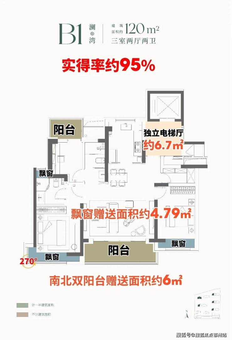 建面120㎡B1户型,约12㎡南北双阳台空间,阳台“买1赠1”,赠送约6㎡,次卧拓展后都有舒适尺度,更附赠约4.79㎡飘窗,实得率约95%。