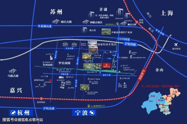 交通优势:项目距高铁南站约6.6公里,可快速抵达上海虹桥;距嘉善站约5公里,火车轻松速达松江。更有通苏嘉甬高铁高速铁路、沪杭高速,申嘉湖高速等多条高速环绕、老沪杭铁路提升工程,形成“2211”轨道交通网络,与周边快速通达。