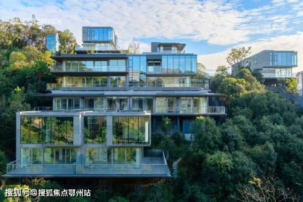依山而筑,层层跌落,阶梯式地隐藏在林间。深沉且消隐的火山石搭配落地及转角玻璃,再加上与半遮蔽的格栅,虚实有致的处理,形成轻盈灵动的建筑韵律。