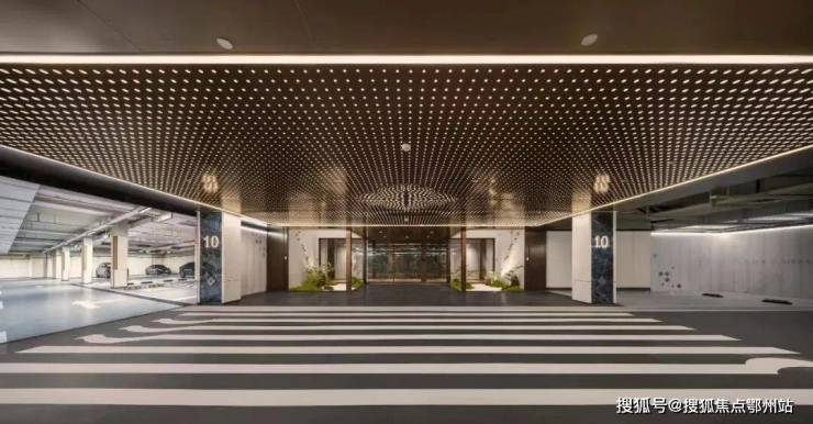 星级酒店风格的车库入口,金属板吊顶logo拼花,入户采用Prada绿岩板背景,瓦楞弧形陶板铺贴。星幕为顶,光厅作序,为业主归家营造璀璨仪式感。