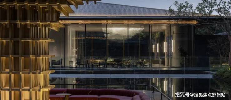 凝聚千载智慧的榫卯艺术 ,以钢制结构再塑,是整个示范区的灵魂之笔,屹立水院中央,翠树环伺,水天相映,既有现代建筑的美感,