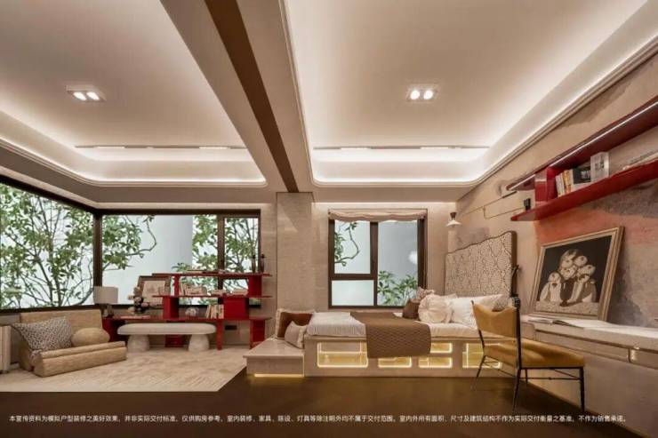 卧室的墙面是定制 3D 立体墙布,有更好的隔音效果,休息的时候帮你隔绝外界的喧嚣;微弧度设计,在心理上营造出被温柔环抱的安全感,营造出静谧的助眠氛围;飘窗也可以灵活改造多种功能。