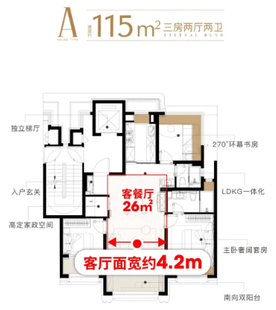 这样的设计支撑起了约26㎡的巨幕通厅,约4.2米的南向客厅开间。这样的设计,远超同面积段的常规水平,搭配全景落地窗与南向阳台,空间通透感直接拉满。餐厅区域更是能轻松放下6人圆桌,让餐厅从单纯的“吃饭区域”,升级为家庭核心社交厅。