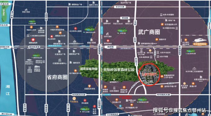 项目北接湘府路,南临时代阳光大道,西侧万家丽高架纵贯南北,东侧红旗路可直达城南