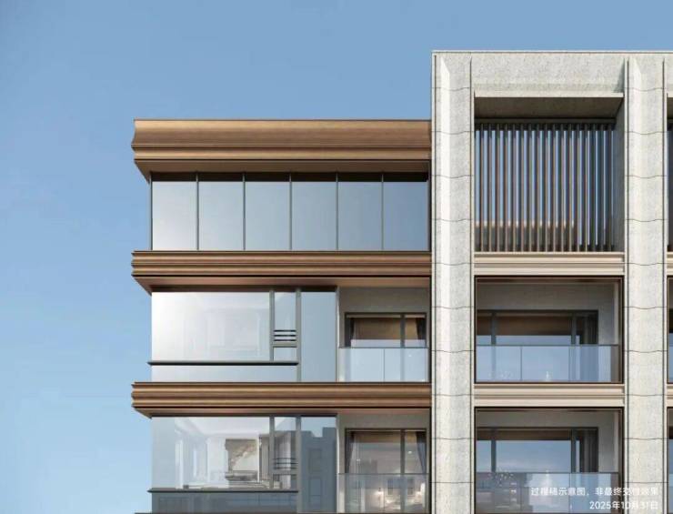 质感立面:采用石材+铝板组合,可视面均为古铜色金属铝板、米黄色铝板/石材,搭配边套270°大转角飘窗,从正面、侧面到背面,立面精致统一,颜值与质感双在线。
