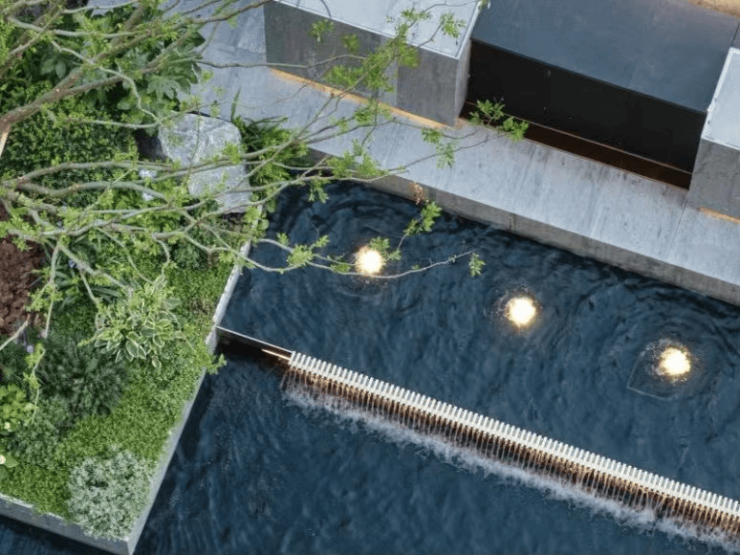三重跌水景观映入眼帘,与全园水系一脉相连,潺潺流动,生生不息。