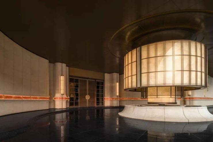 另外,项目首层通过硬朗直线呼应柔和曲线勾勒,辅以温润石材与古铜色金属线条融合,打造东西方美学共融的艺术藏品