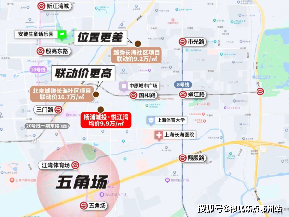 去年二批次土拍杨浦长海地块,联动价大涨!联动价突破了10W+,来到了10.7万/m²!比南侧400米的杨浦城投·悦江湾贵了8000元/㎡! 中环旁双轨交+新江湾+五角场的【杨浦城投·悦江湾】成最大赢家!