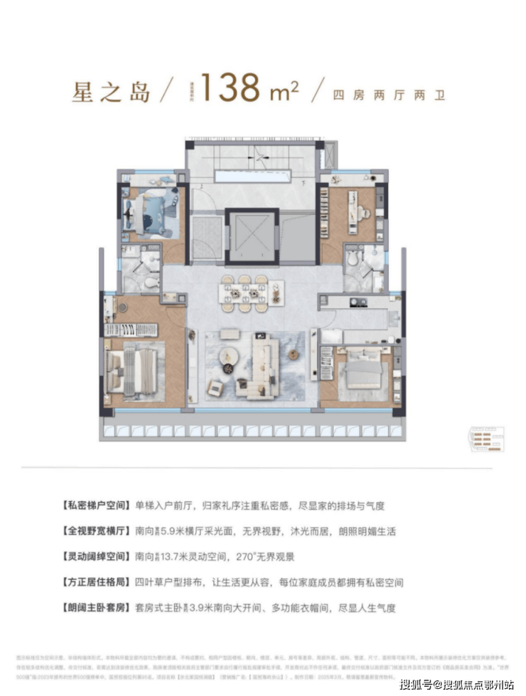 这个户型首先映入眼帘的,就是超级奢阔的面宽。大尺度横厅的设计 ,让居者尽享阳光与清风。 约3.4米层高 的设计,不惜增加成本,来达到舒适度的大幅升级。独立电梯厅入户,仪式感十足。 主卧步入式衣帽间,套房设计 ,气度非凡。