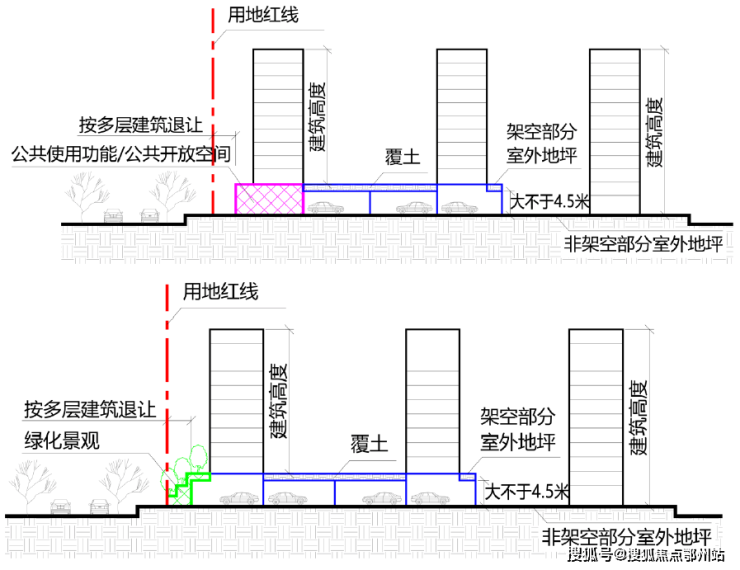 居住用地内位于底层架空平台下方的停车空间,结构层高应不大于4.5米,以平台(含覆土)面层作为室外地坪计算平台以上的建筑基底面积、绿地面积。