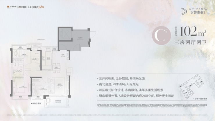 以及我们的网红爆款,建面约102㎡(C户型)三房两厅两卫,不仅保留了其小户型所有的优势,更增强了空间感和舒适度!